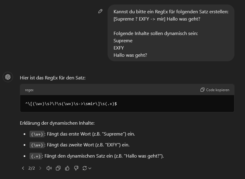 Grundsätzlich solltest du das hier erstelle RegEx nochmal mit RegEx101 validieren. Wenn du feststellst, dass das Reg-Ex nicht matcht, drücke in ChatGPT auf regenieren und versuche es erneut. (passiert manchmal) Gebe immer an welchen Inhalt du Erkennen möchtest und was sich an dem Inhalt dynamisch ändert. Hier ein Beispiel für die Reg-Ex Erstellung mit ChatGPT:
