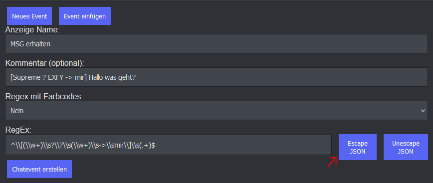 Füge das erstelle RegEx im Event ein und Drücke auf EscapeJson um es für die Config vorzubereiten.