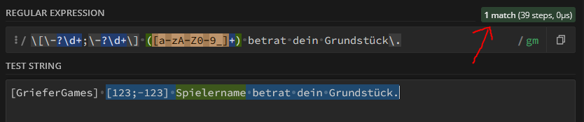 An der Rechten Seite findest du jede Menge Infos über dein RegEx-Muster. Wenn du damit garnicht klar kommst, kannst du auch einfach CHATGPT nutzen.