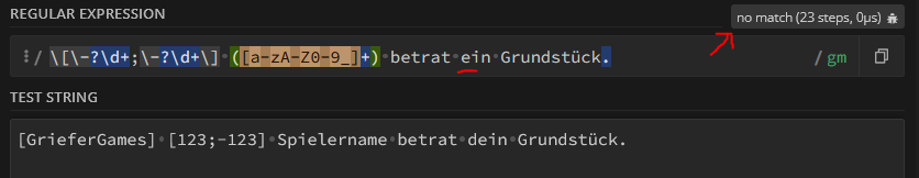 Die Seite RegEx101.com ist eine sehr gute Seite, um RegEx-Muster zu testen und zu validieren. Hier kannst du dein RegEx-Muster eingeben und es mit einer Nachricht testen. Hier ist ein Beispiel wo das RegEx richtig ist und eins wo die Validierung falsch ist.